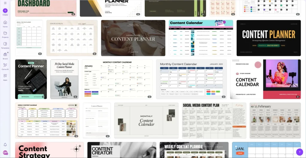 Canva bukan hanya untuk desain grafis, tetapi juga mendukung pembuatan kalender konten sosial media. Anda bisa memanfaatkan template kalender yang sudah tersedia untuk merencanakan dan memvisualisasikan ide posting. Kelebihannya, desain bisa langsung dibuat di Canva dan dijadwalkan terbit menggunakan fitur integrasi dengan platform media sosial.